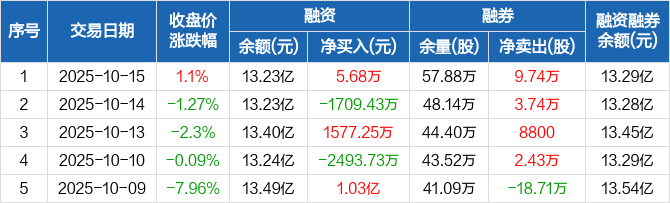 融资方面,当日融资买入3039.79万元,融资偿还3034.11万元,融资净买入5.68万元。融券方面,融券卖出9.74万股,融券偿还0股,融券余量57.88万股,融券余额639万元。融资融券余额合计13.29亿元。