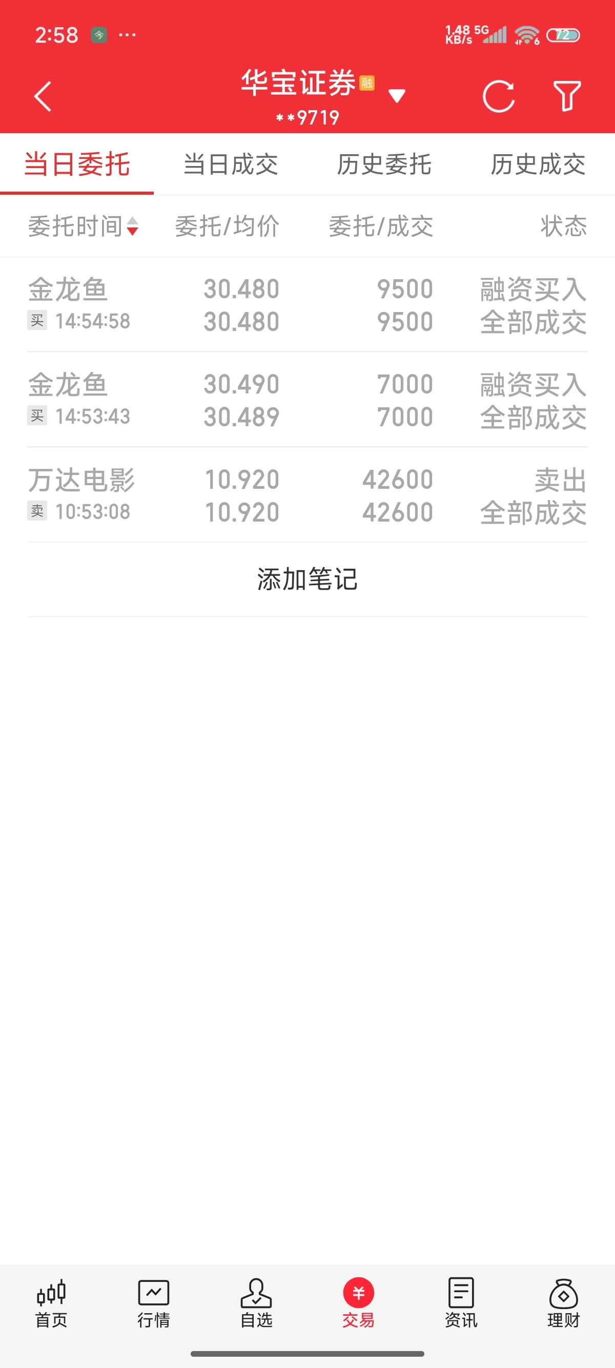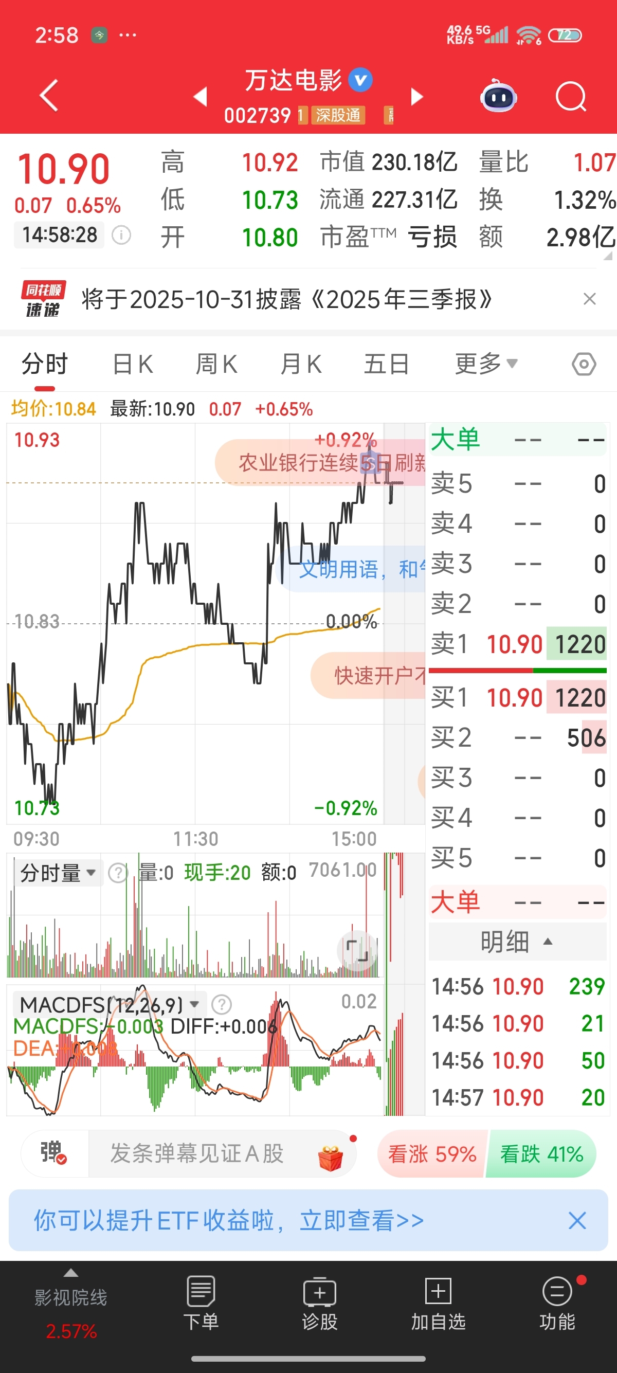 万达电影早上10点多挂单10.92卖出。居然最高价卖了!赚了1200走了。
