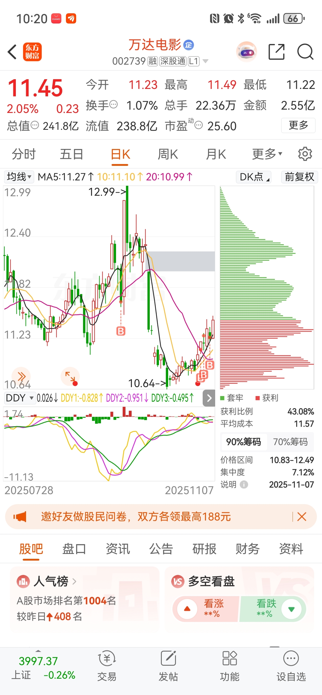 $万达电影(SZ002739)$ 买入第一天涨停,一直没走反而亏了好多,这几天补了三次终于盈利。今天打算卖掉一点让支票在持仓里红几天