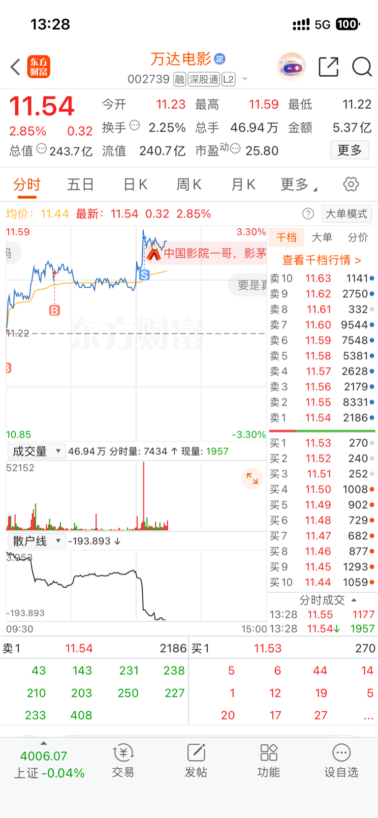 $万达电影(SZ002739)$ 加仓好多天,今天小T一下吧。如果走加速就继续买,如果回调,就低吸。