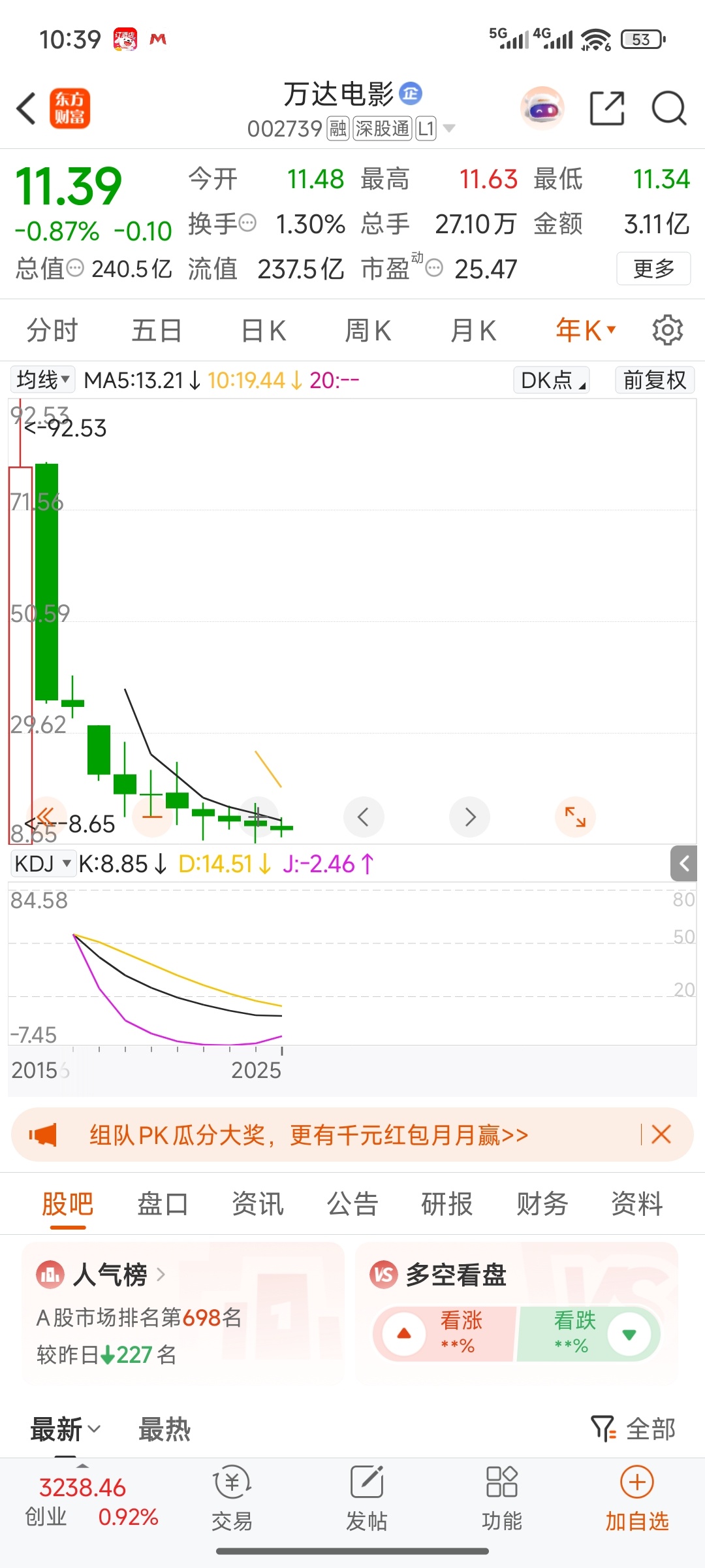 $万达电影(SZ002739)$ 你们想买入的,先看看年k再考虑下,连续跌了十年,为什么不能再跌11年。这种票参与交易的意义在哪里?想钱想疯了?