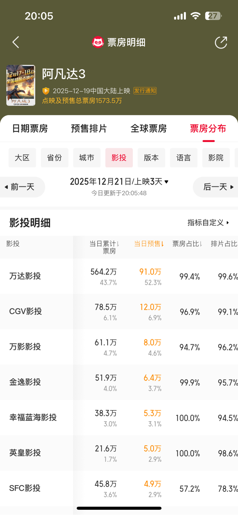 $万达电影(SZ002739)$ 阿凡达3到目前为止1570万的预售中,万达影投居然有564万,占比达36%。太牛了!