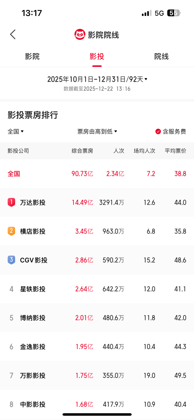 $万达电影(SZ002739)$ 真奇怪,跌这么多。阿凡达票房有点低关万达电影什么,动物城周末又增长了阿!2025年还有一个周末和一个31日,少说还有10亿票房,全年520亿,第四季度100亿,万达电影第四季度肯定盈利的啊?跌这么多是为了什么?