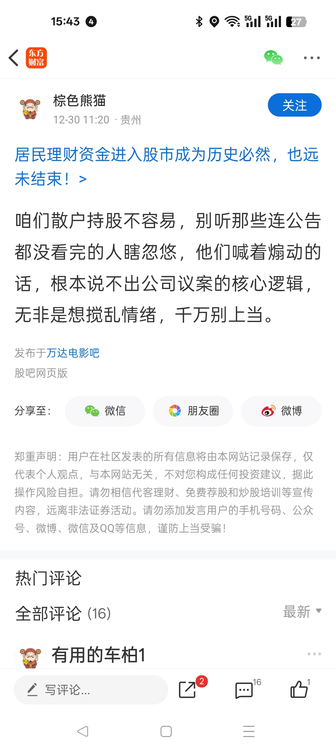 温馨提示: 1.根据《证券法》规定,禁止编造、传播虚假信息或者误导性信息,扰乱证券市场;2.用户在本社区发表的所有资料、言论等仅代表个人观点,与本网站立场无关,不对您构成任何投资建议。用户应基于自己的独立判断,自行决定证券投资并承担相应风险。《东方财富社区管理规定》