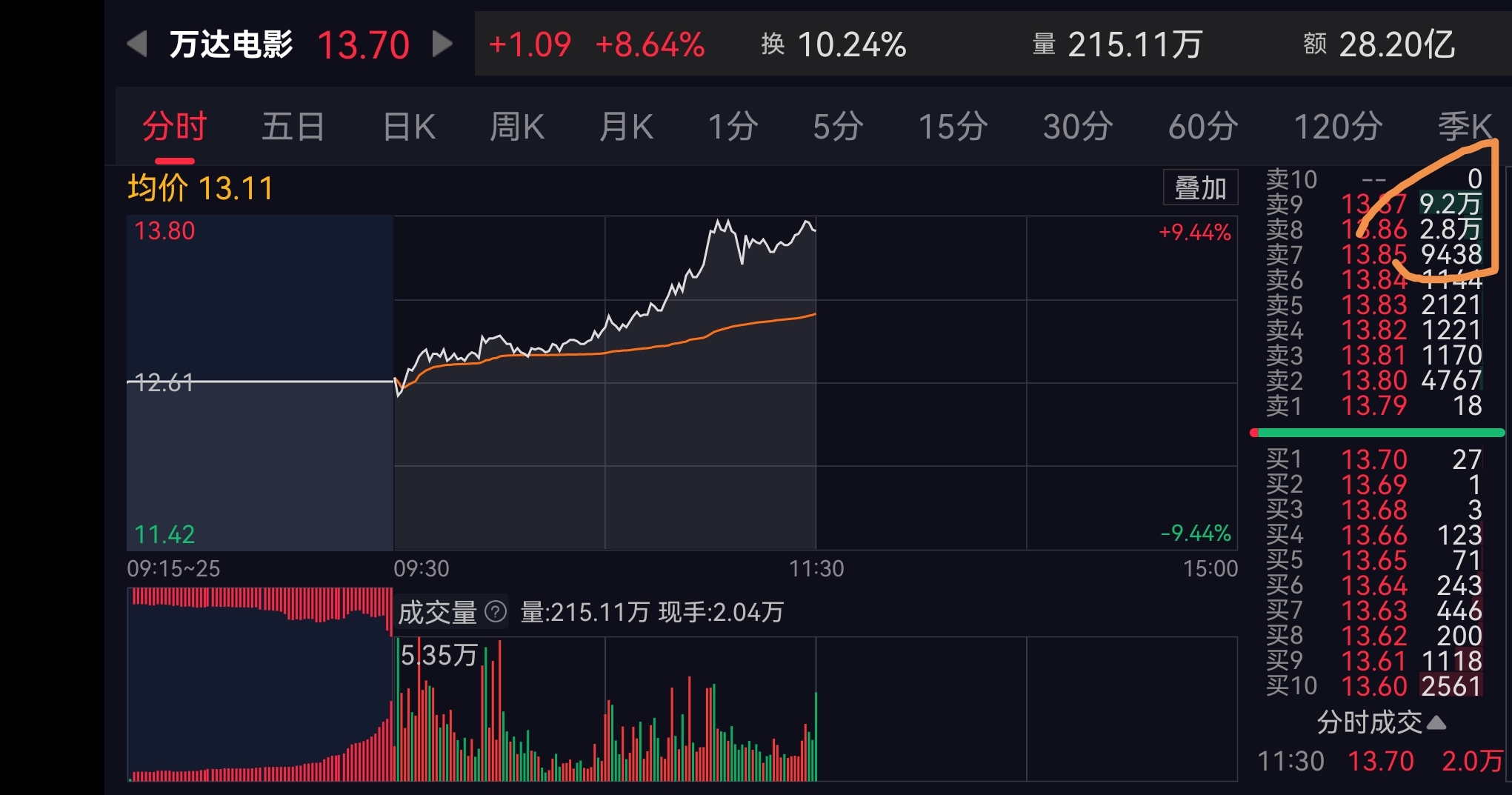 $万达电影(SZ002739)$ 拿稳了,涨停价挂单从1.2万手到现在9.2万,下午开盘直线冲涨停