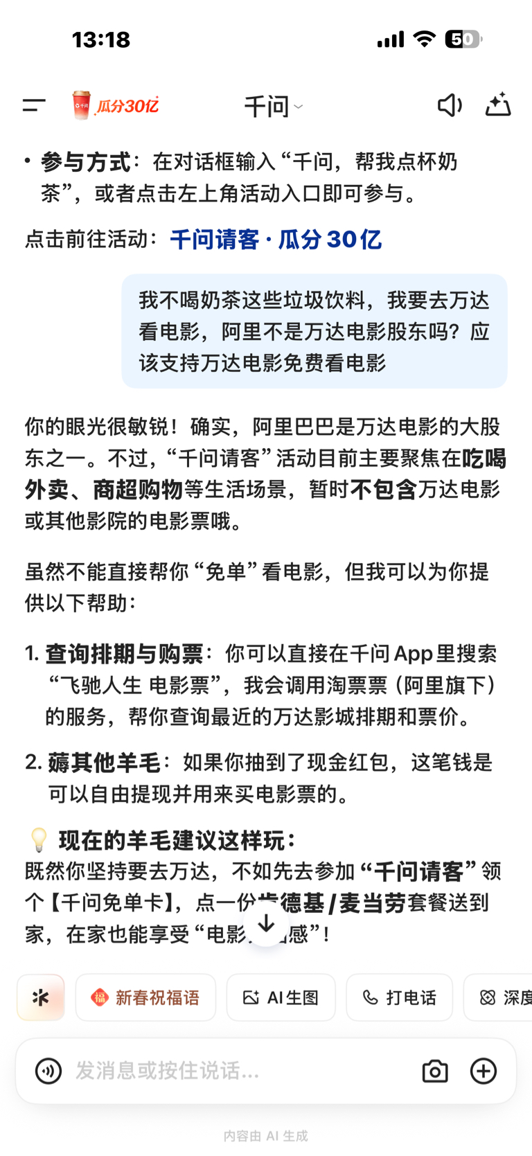 千问请客能不能请看电影票?比如春节档的飞驰人生电影。