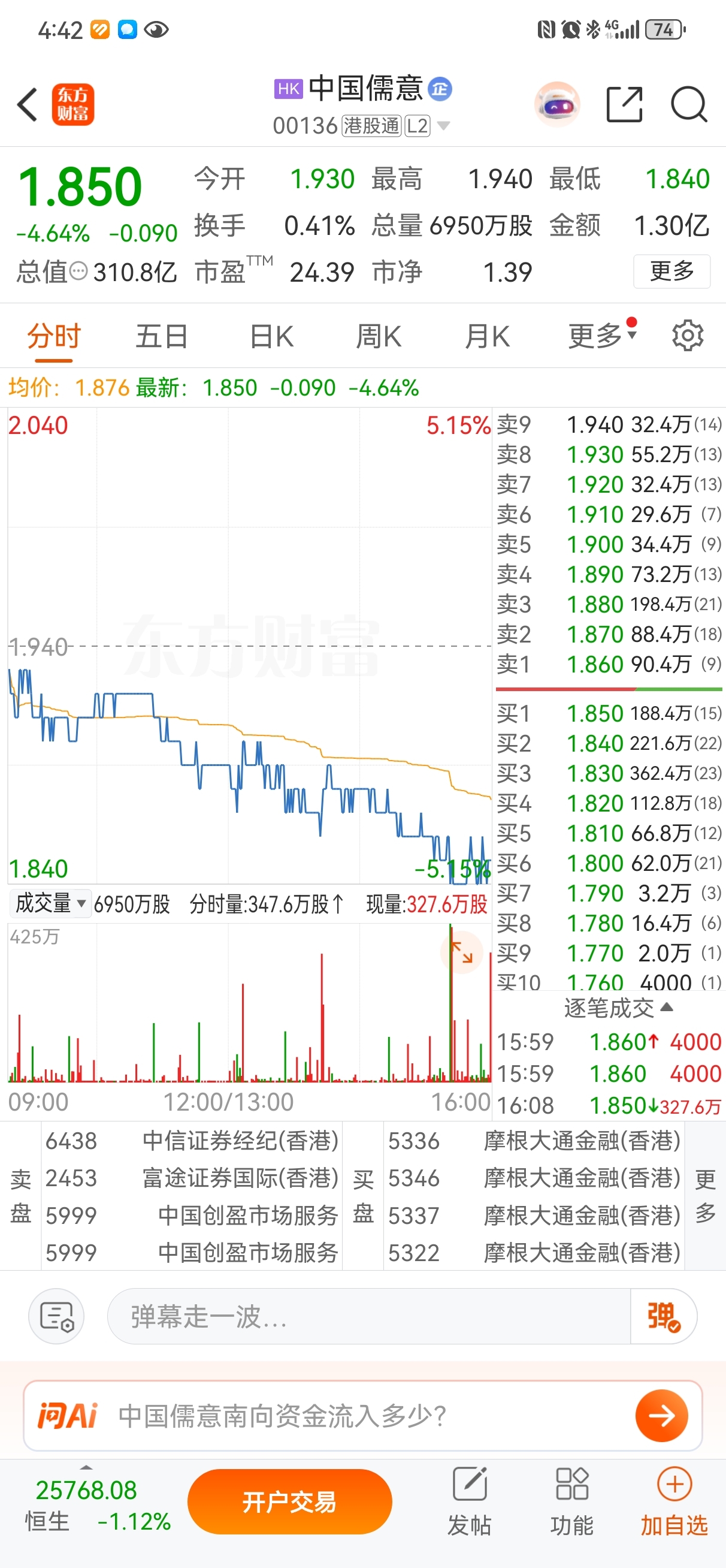 港股儒意也是在跌,但买方席位还有摩根,这种资金肯定是聪明的吧,所以我们大胆的假设