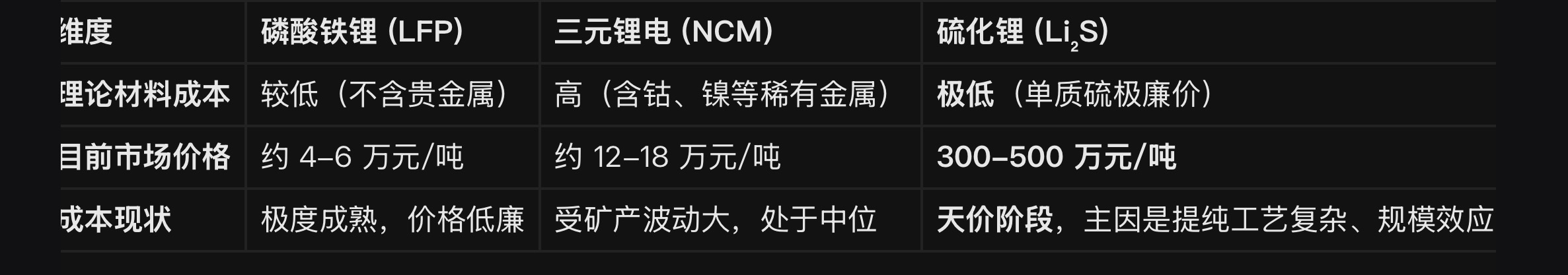 硫化锂,能量密度、安全性均高于现有磷酸铁锂、三元锂电,但成本一直高居不下,这也是