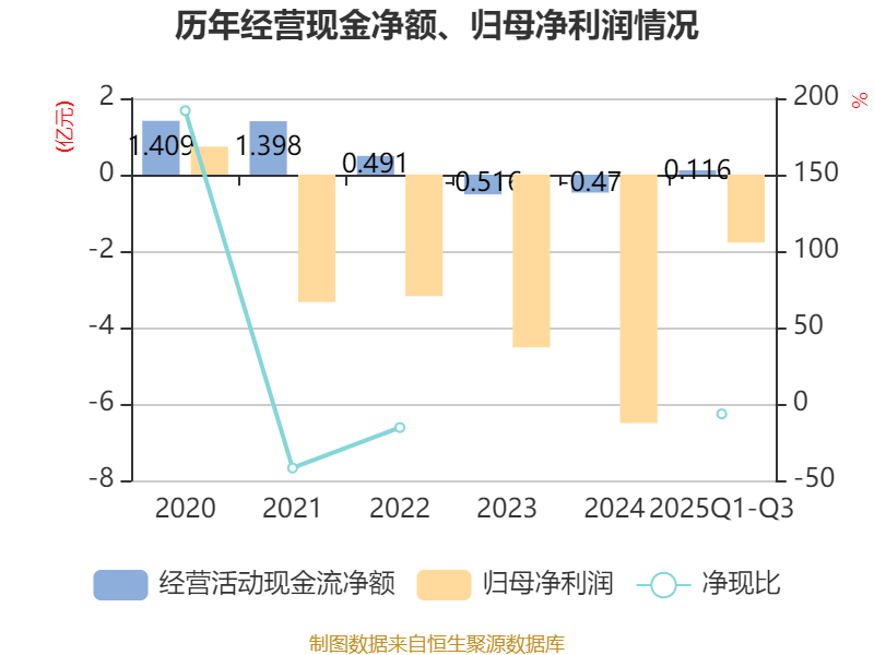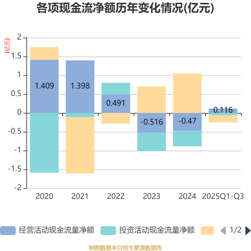 2025年前三季度,公司经营活动现金流净额为1160.42万元,同比增加3874.71万元;筹资活动现金流净额-1934.62万元,同比减少4259.06万元;投资活动现金流净额-599.48万元,上年同期为-3719.64万元。