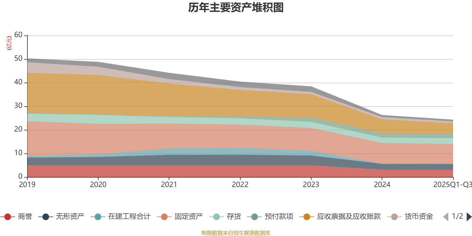 资产重大变化方面,截至2025年三季度末,公司应收票据及应收账款较上年末减少25.76%,占公司总资产比重下降4.44个百分点;存货较上年末增加9.2%,占公司总资产比重上升1.58个百分点;预付款项较上年末增加9.16%,占公司总资产比重上升1.26个百分点;商誉较上年末没有变化,占公司总资产比重上升0.96个百分点。