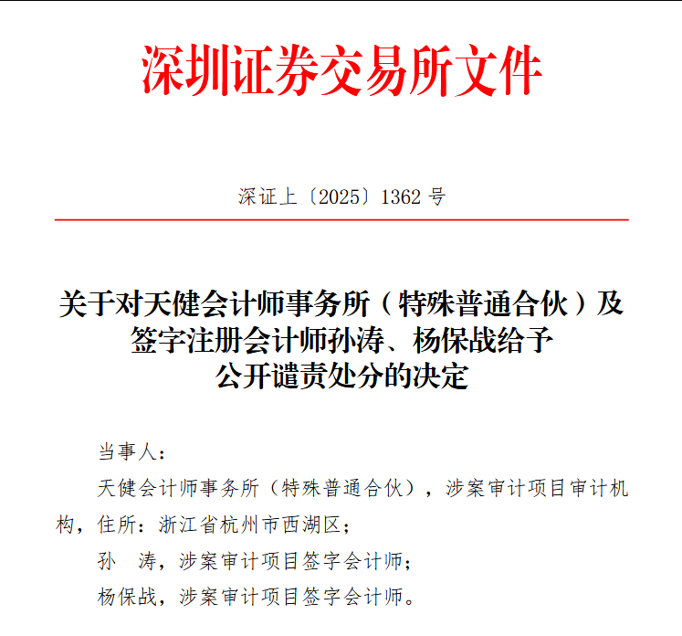 深交所认定,天健所的上述行为违反了《股票上市规则(2025年修订)》第1.4条、第12.1.2条、第12.1.3条、第12.1.4条及第12.3.3条的规定;签字会计师孙涛、杨保战作为直接负责的主管人员,违反了《股票上市规则(2025年修订)》第1.4条、第12.1.2条及第12.3.3条的规定。