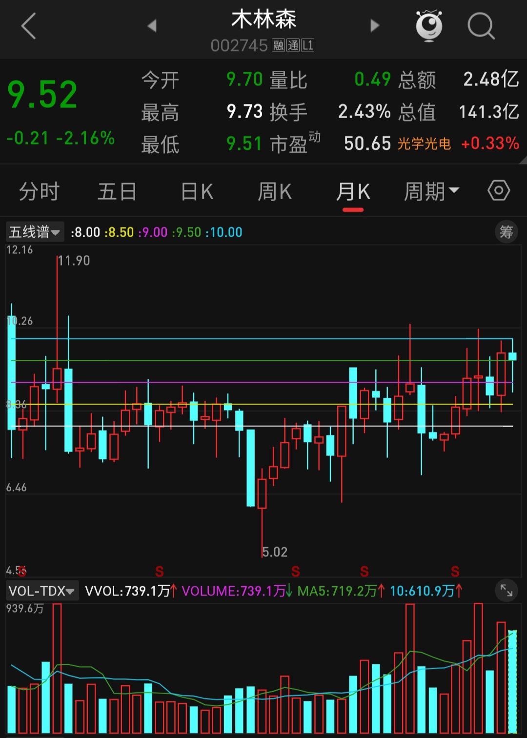$木林森(SZ002745)$ 从月线看,自22年4月跌入10元以后,长期运行在8.5下方,而最近几个月都收在8.5以上。从日线看下半年主要在8.5到10区间做箱体运动,近日站上9有重新站上10可能。