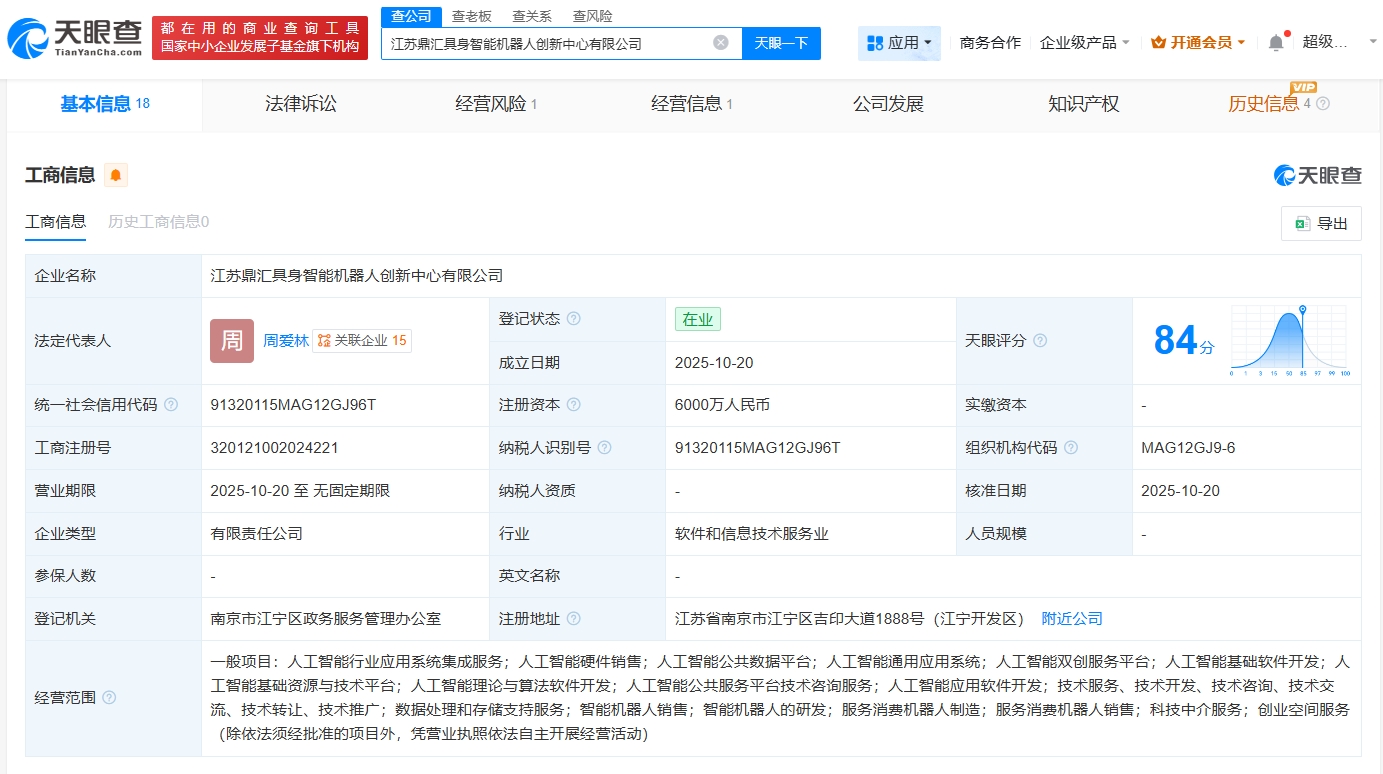 南方财经10月21日电,天眼查工商信息显示,近日,江苏鼎汇具身智能机器人创新中心有限公司成立,法定代表人为周爱林,注册资本6000万人民币,经营范围包括人工智能行业应用系统集成服务、人工智能硬件销售、人工智能公共数据平台、人工智能通用应用系统等。股东信息显示,该公司由埃斯顿(002747)、江苏亨通线缆科技有限公司、绿的谐波(688017)、安培龙(301413)、泉峰汽车(603982)等共同持股。