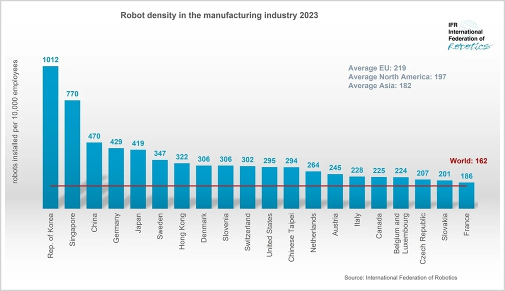 根据国际机器人联合会(IFR)之前的一份报告,中国每万名员工大约有470台机器人,远远低于韩国的1012台和新加坡的770台。