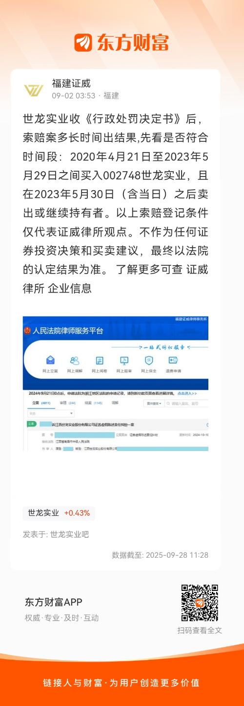 世龙实业收《行政处罚决定书》后,索赔案多长时间出结果,先看是否符合时间段:2020年4月21日至2023年5月29日之间买入002748世龙实业,且在2023年5月30日(含当日)之后卖出或继续持有者。以上索赔登记条件仅代表证威律所观点。不作为任何证券投资决策和买卖建议,最终以法院的认定结果为准。 了解更多可查 证威律所 企业信息