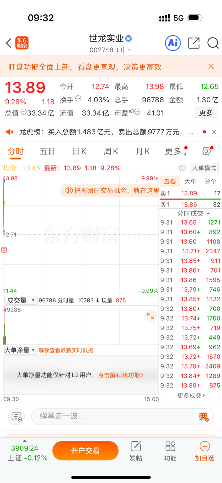 开盘介入的个股$世龙实业(SZ002748)$ 成功拿下涨停