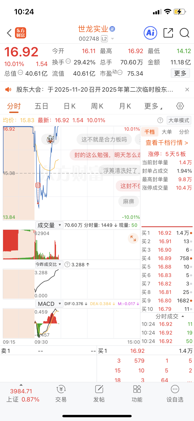 $世龙实业(SZ002748)$ 半场开个庆贺,希望今天分歧转一致做龙头