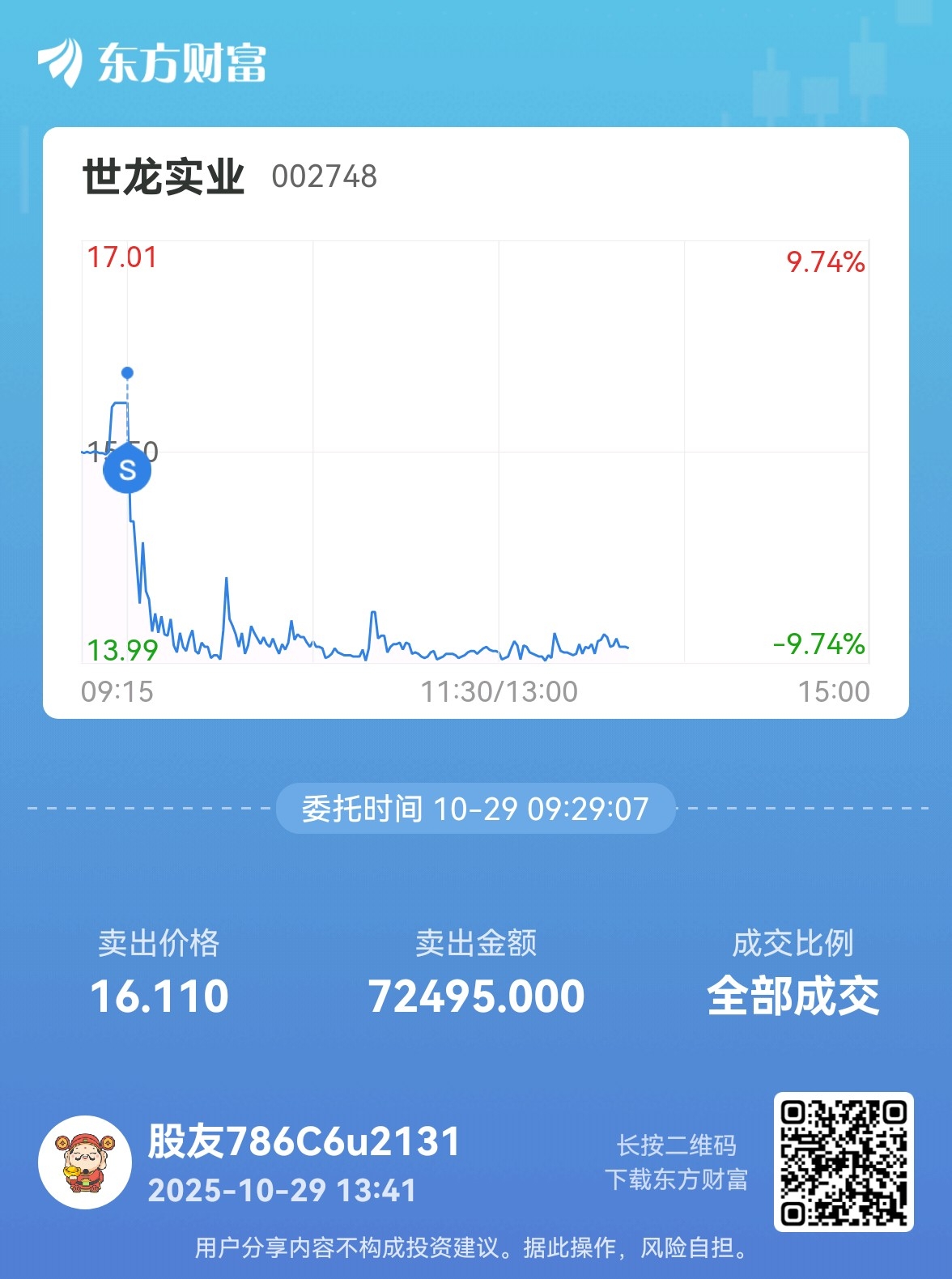 $世龙实业(SZ002748)$ 幸好早上跑的快