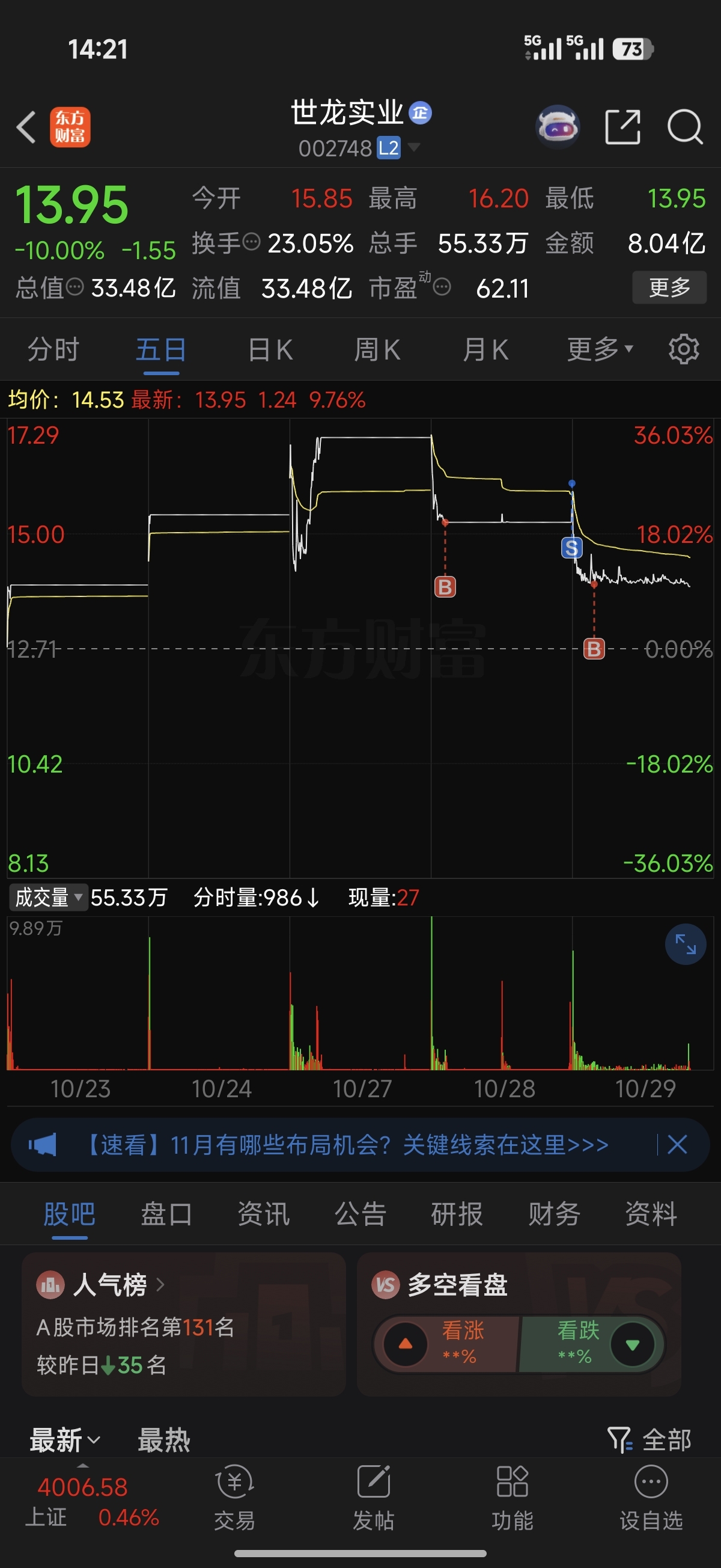 $世龙实业(SZ002748)$ 太棒了终于跌停了,底仓都还有利润,明天抄底