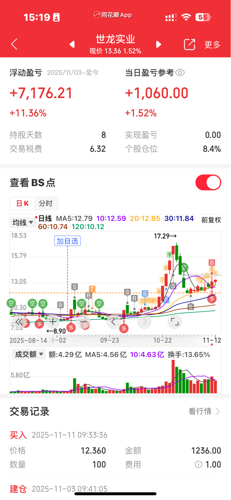 $世龙实业(SZ002748)$ 来来回回给我赚5万多块钱