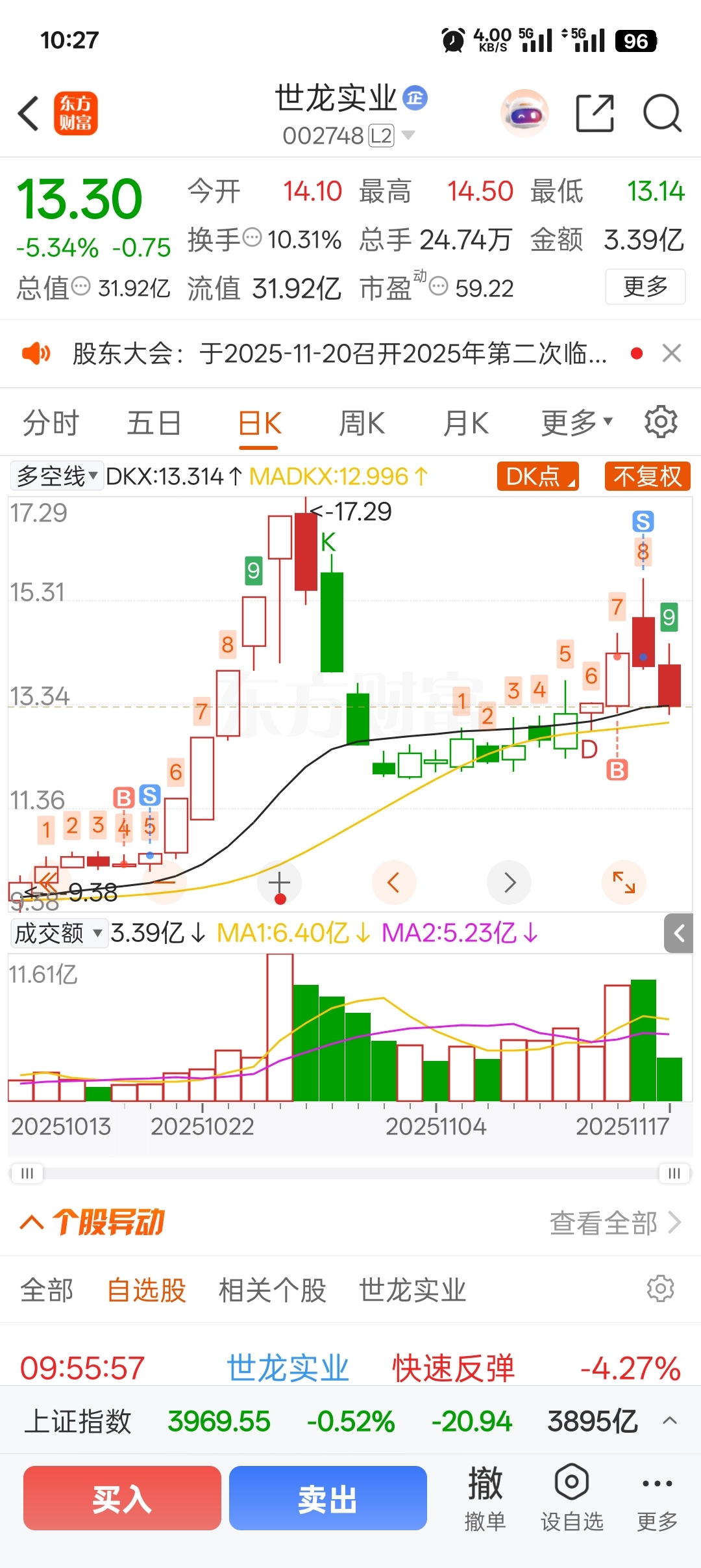 $世龙实业(SZ002748)$ 周五涨停都没有走,尾盘才走,行为没时间看盘面,叫夫人早盘9.40左右卖出,结果她磨磨唧唧半天没出那天心情特别糟糕