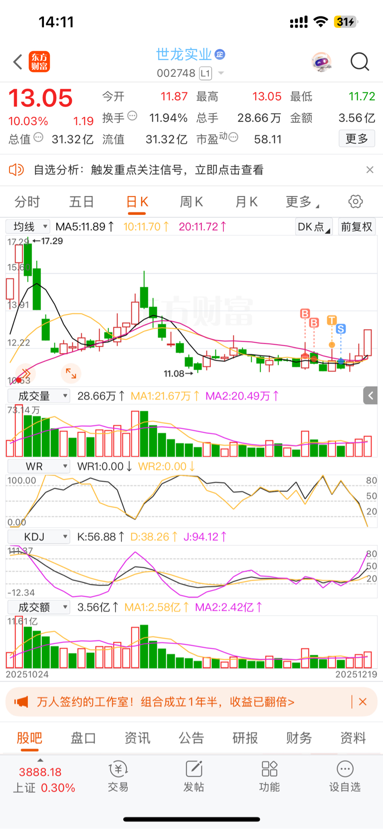$世龙实业(SZ002748)$ 12.10,12.15追了两次被埋。理论你应该涨,就是不涨。贱的要死