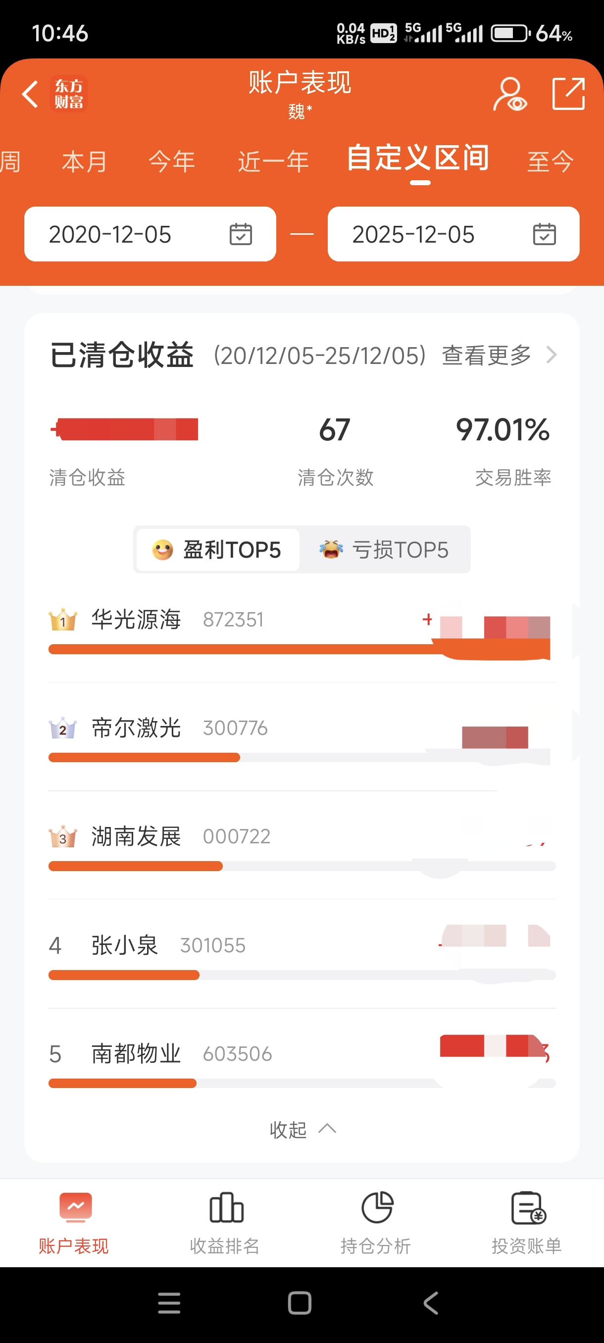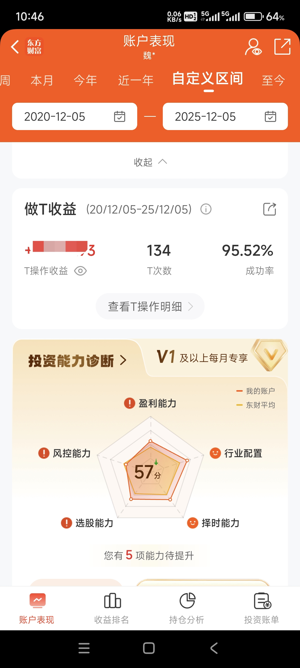 但愿我的卖出换来连续涨停。五年收益72%有点低。做T成功95.5%。清仓胜率97