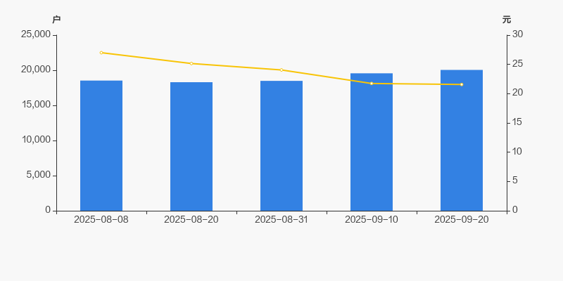 自2025年8月20日以来,公司股东户数连续3期上涨,截至目前增幅为9.56%。2025年8月20日至2025年9月20日区间股价下降14.23%。