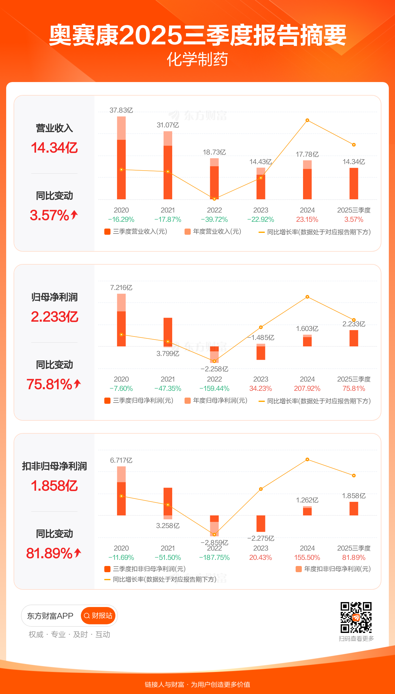 奥赛康10月29日发布2025年三季报显示,公司前三季实现营业收入14.34亿元,同比增长3.57%;归母净利润2.23亿元,同比增长75.81%;扣非归母净利润1.86亿元,同比增长81.89%。