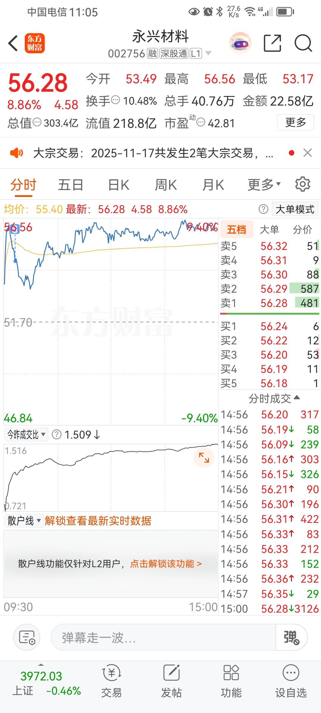 $永兴材料(SZ002756)$ 到56.56回落了,就先撤了,留下的发财~