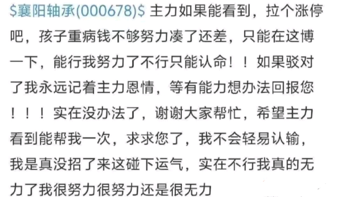 1. 求助帖刷屏 :2025年11月27日,一位河南IP的股民在股票社区发帖求助,称孩子身患重病,治疗费用存在很大缺口,无奈之下恳请主力将襄阳轴承的股价拉至涨停,自己好卖出股票筹措医药费,帖子满是无助之情,很快就在股吧、短视频等平台疯狂传播。
