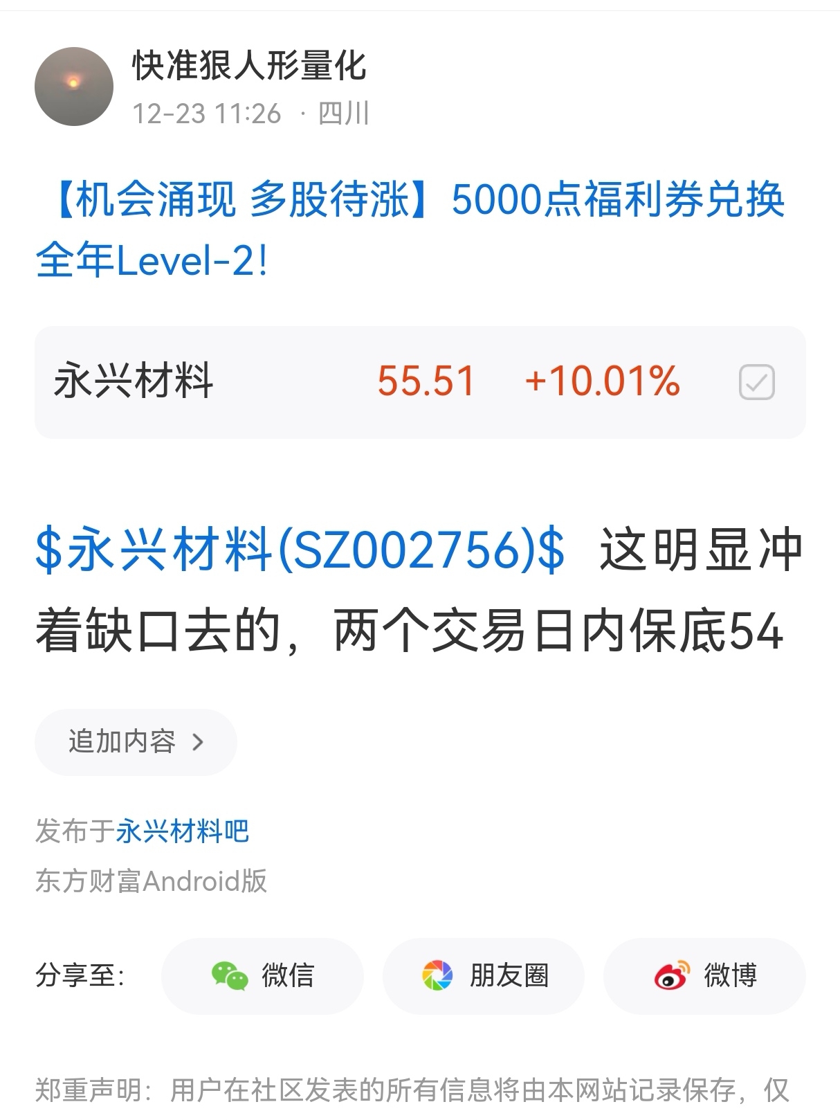温馨提示: 1.根据《证券法》规定,禁止编造、传播虚假信息或者误导性信息,扰乱证券市场;2.用户在本社区发表的所有资料、言论等仅代表个人观点,与本网站立场无关,不对您构成任何投资建议。用户应基于自己的独立判断,自行决定证券投资并承担相应风险。《东方财富社区管理规定》