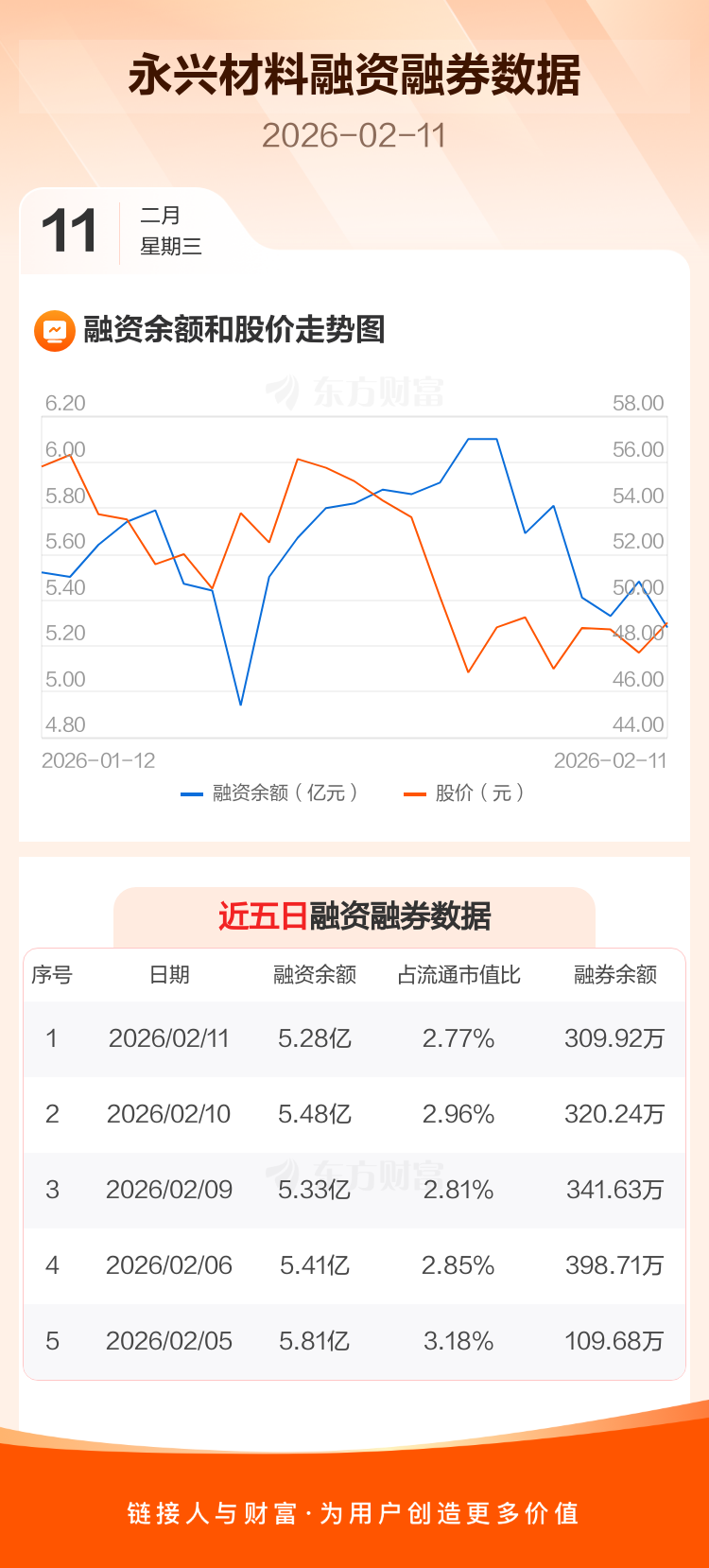 交易所最新数据显示,永兴材料于2026年2月11日获融资买入4898.36万元,融资偿还6887.35万元,当日融资净偿还1988.99万元。目前,该股融资余额5.28亿,占流通市值比例为2.77%。