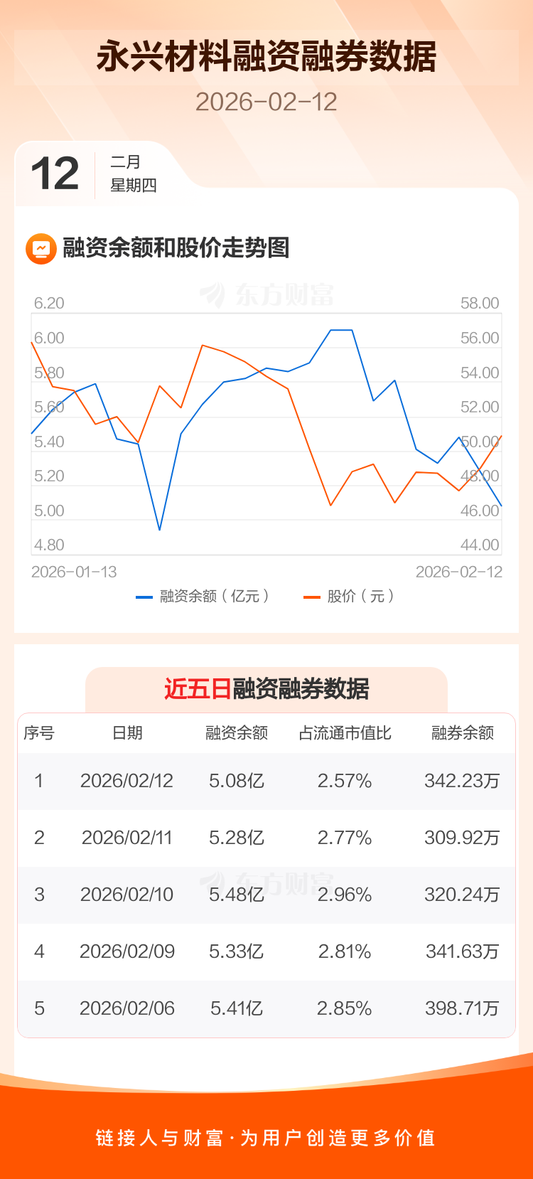 交易所最新数据显示,永兴材料于2026年2月12日获融资买入4266.62万元,融资偿还6252.47万元,当日融资净偿还1985.85万元。目前,该股融资余额5.08亿,占流通市值比例为2.57%。