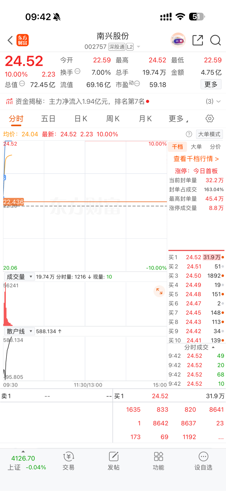 $南兴股份(SZ002757)$ 靠 竞价卖飞了一半 真没想到这么猛啊 一点犹豫时间都不给 就起飞了 23.2那会差点买回去了啊 就秒板了 看样子后面两天都是板了
