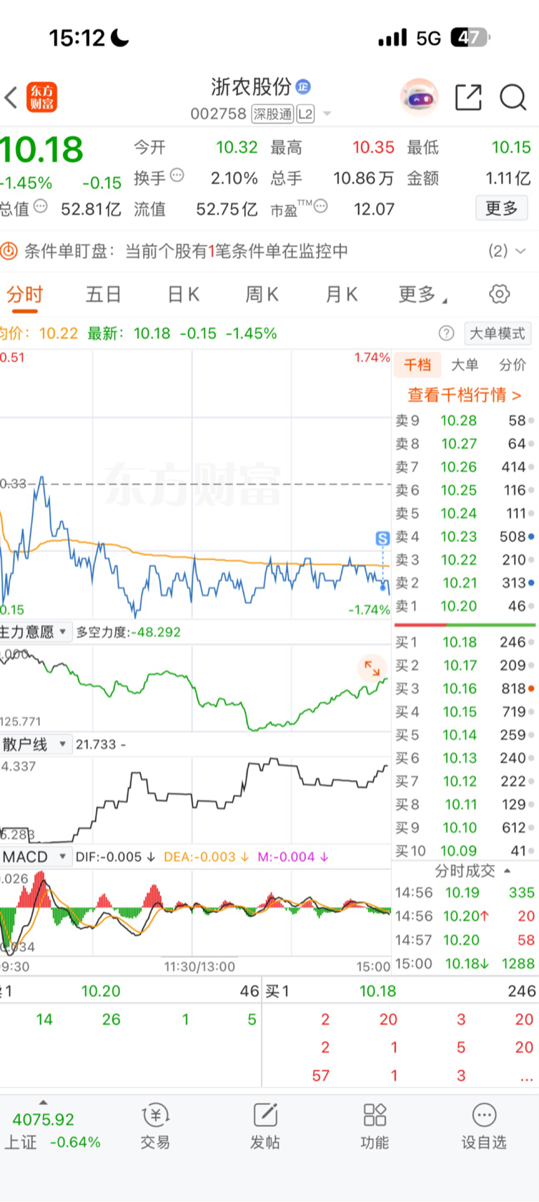 $浙农股份(SZ002758)$ 尾盘彻底清仓,一号文件利好已落地 以后就等跌到9元接回来