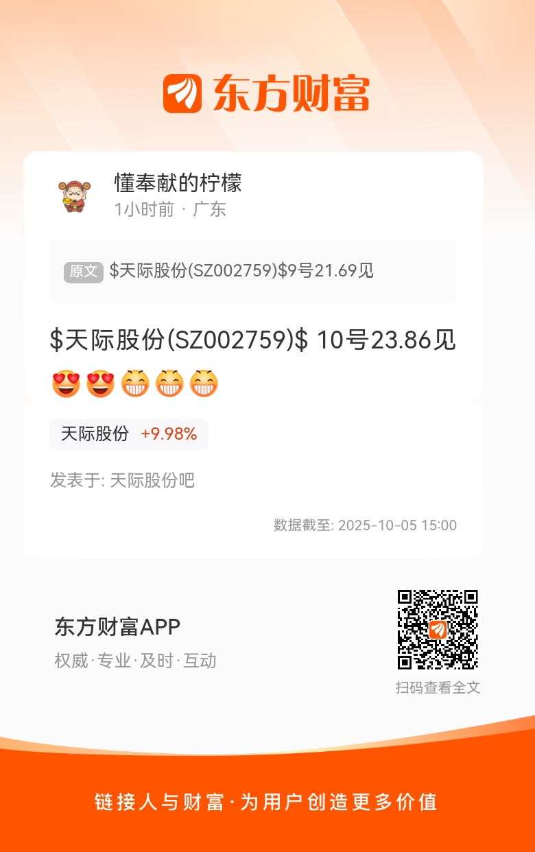 13号26.25见//@懂奉献的柠檬 :$天际股份(SZ002759)$10号23.86见