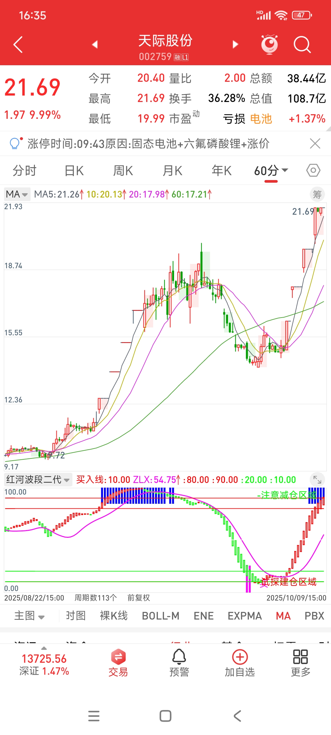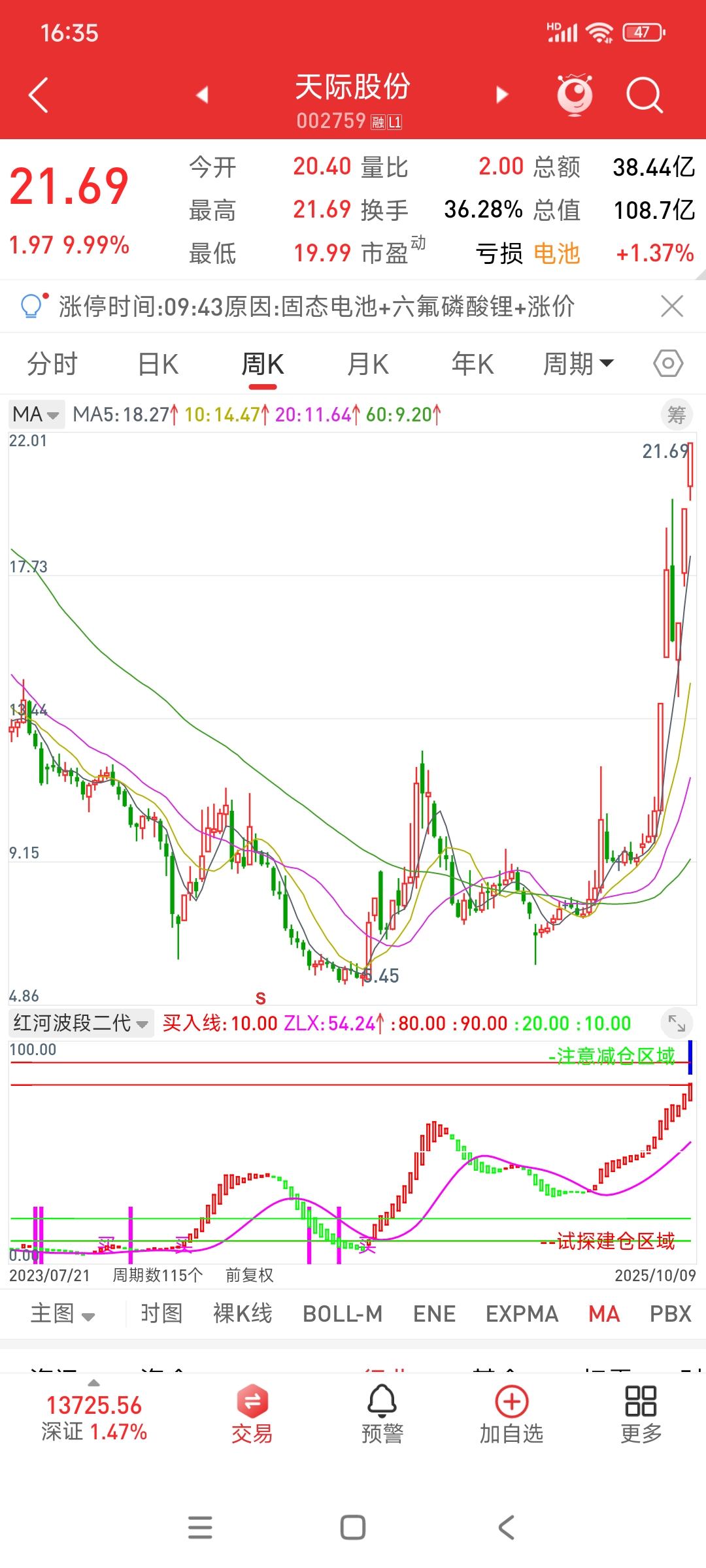 $天际股份(SZ002759)$ 周线级别红柱延续,大方向看涨毫无疑问,前几天的回调其实就是60分钟顶部红柱转绿柱,然后跌到底部以后绿柱转红柱罢了,底部绿柱转红柱以后一路上扬,今天继续涨停,所以红柱不停,上涨不止,红柱拉长,加速不止,继续冲