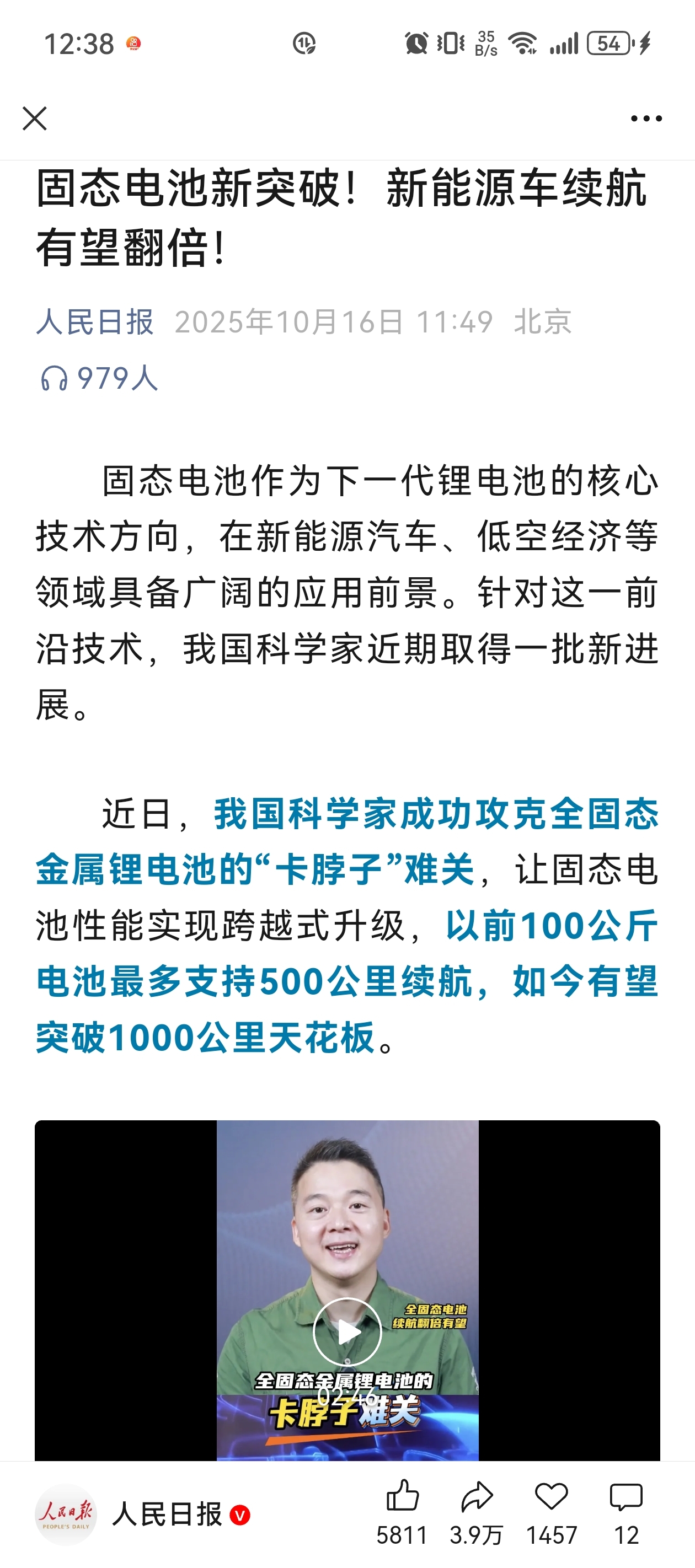 $天际股份(SZ002759)$ 人民日报发表了固态电池技术突破