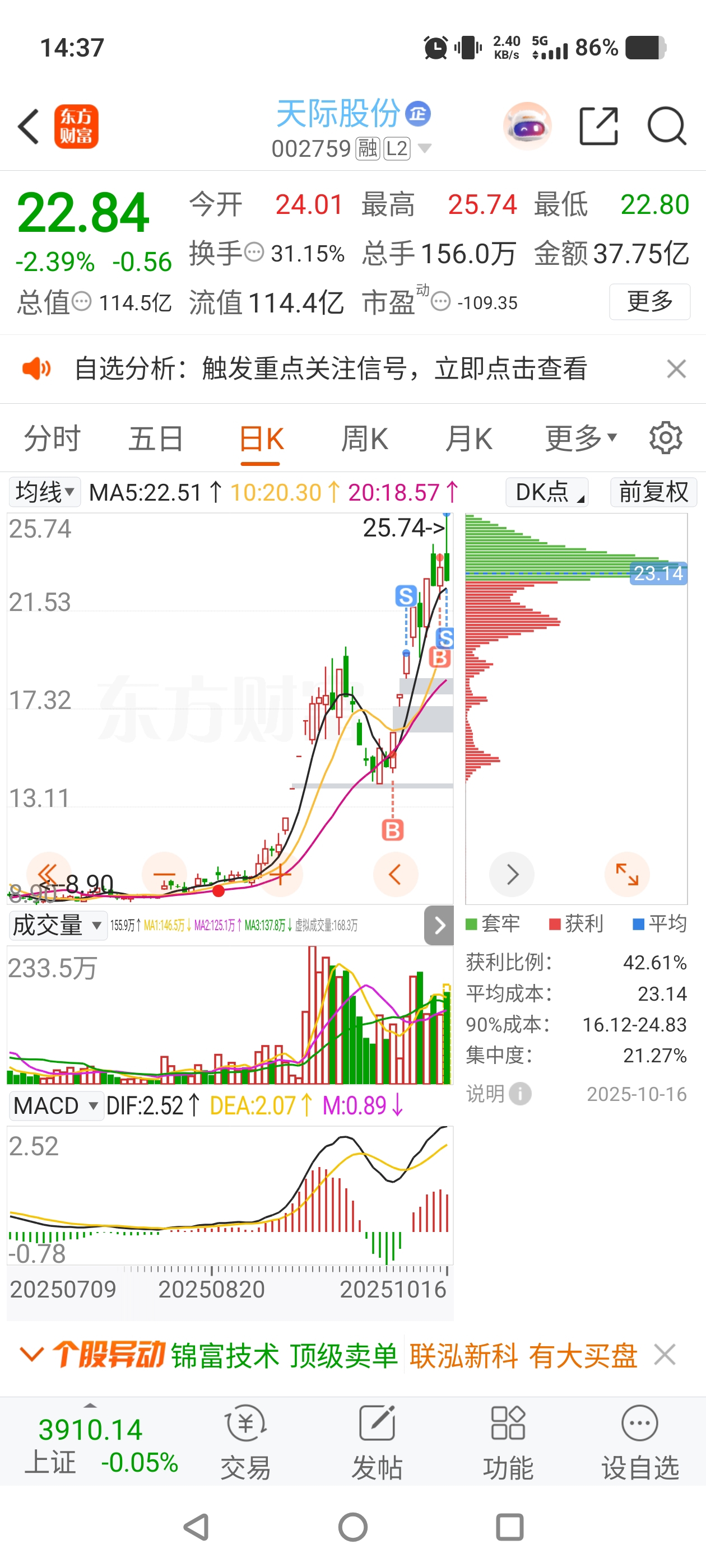$天际股份(SZ002759)$ 这股不错,每次进都没套我,今天涨停就跑了,还好跑了,留下的发财