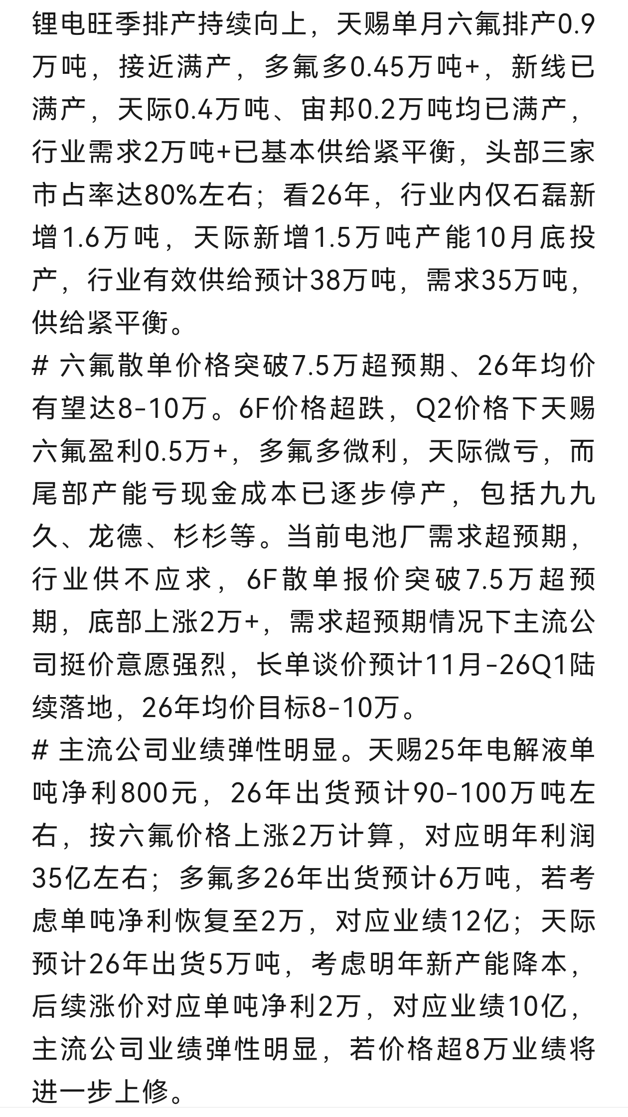 $天际股份(SZ002759)$ $天赐材料(SZ002709)$ $多氟多(SZ002407)$ 6F涨价对基本面影响最大的是天际,其次是天赐和多氟多。与以往化工涨价炒作不一样,之前都是因产能问题导致短暂的供需平衡,这次是需求放量的大周期起点