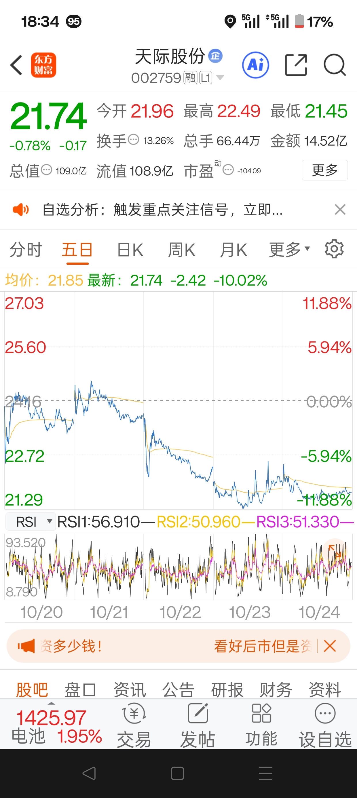$天际股份(SZ002759)$ 天际股份,五天线面临补涨