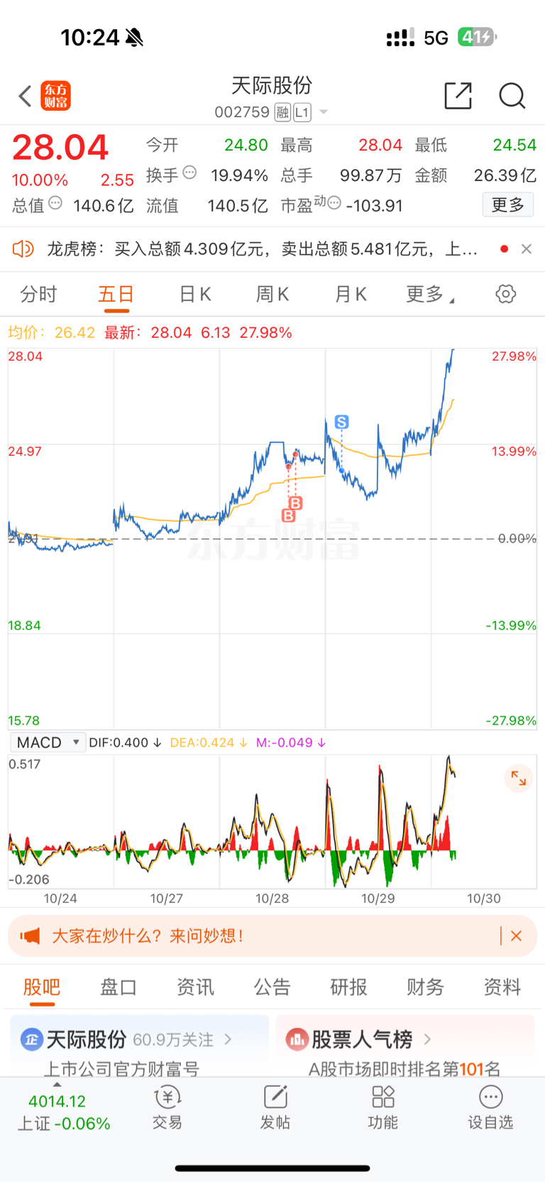 $天际股份(SZ002759)$ 我昨天亏本卖你,你今天就给我涨停?什么意思?