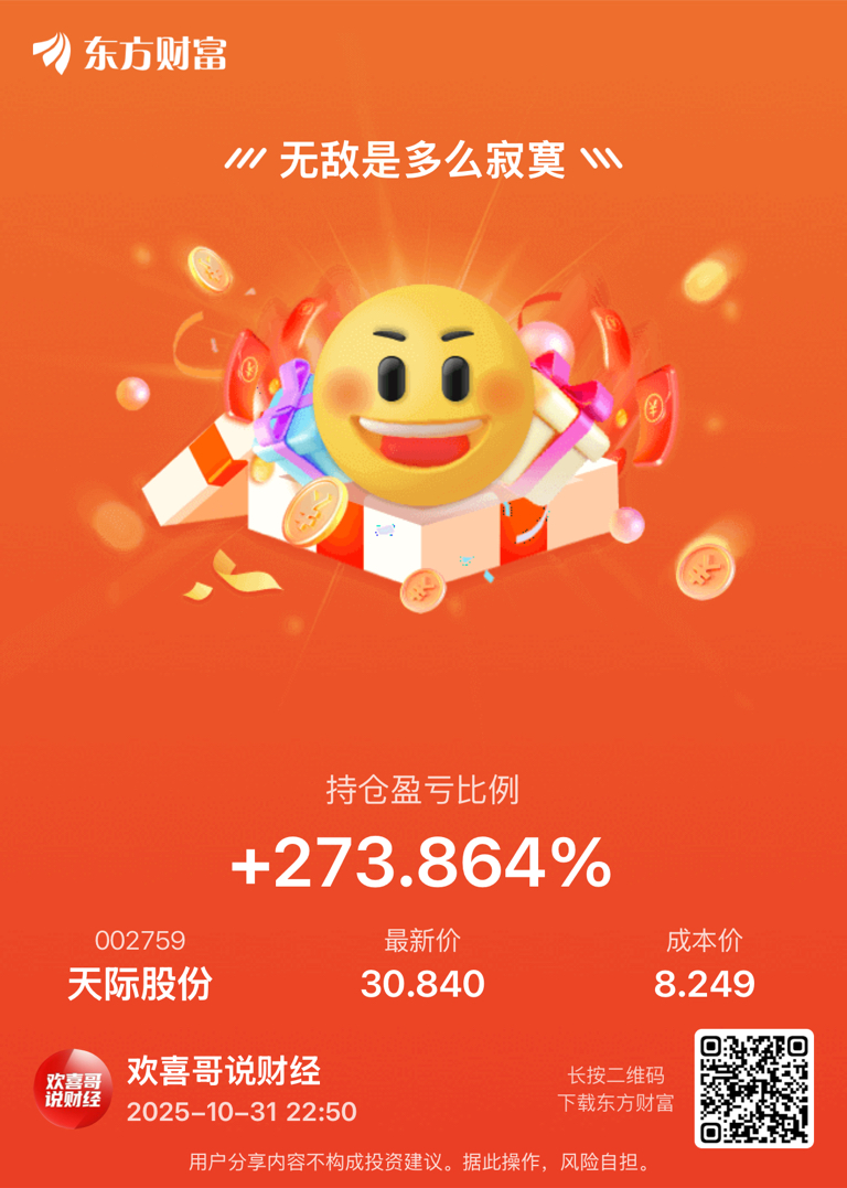 $天际股份(SZ002759)$ 天际反复做了40多天,成了10月份收益率最高的持仓,目前这个位置风险已经明显大于机会了,这个时候去开仓追涨被挂的可能性很大,所以不建议。手中有低成本底仓的继续拿住,出现跌破支撑撤出,不跌破就可以继续做T拉低成本。