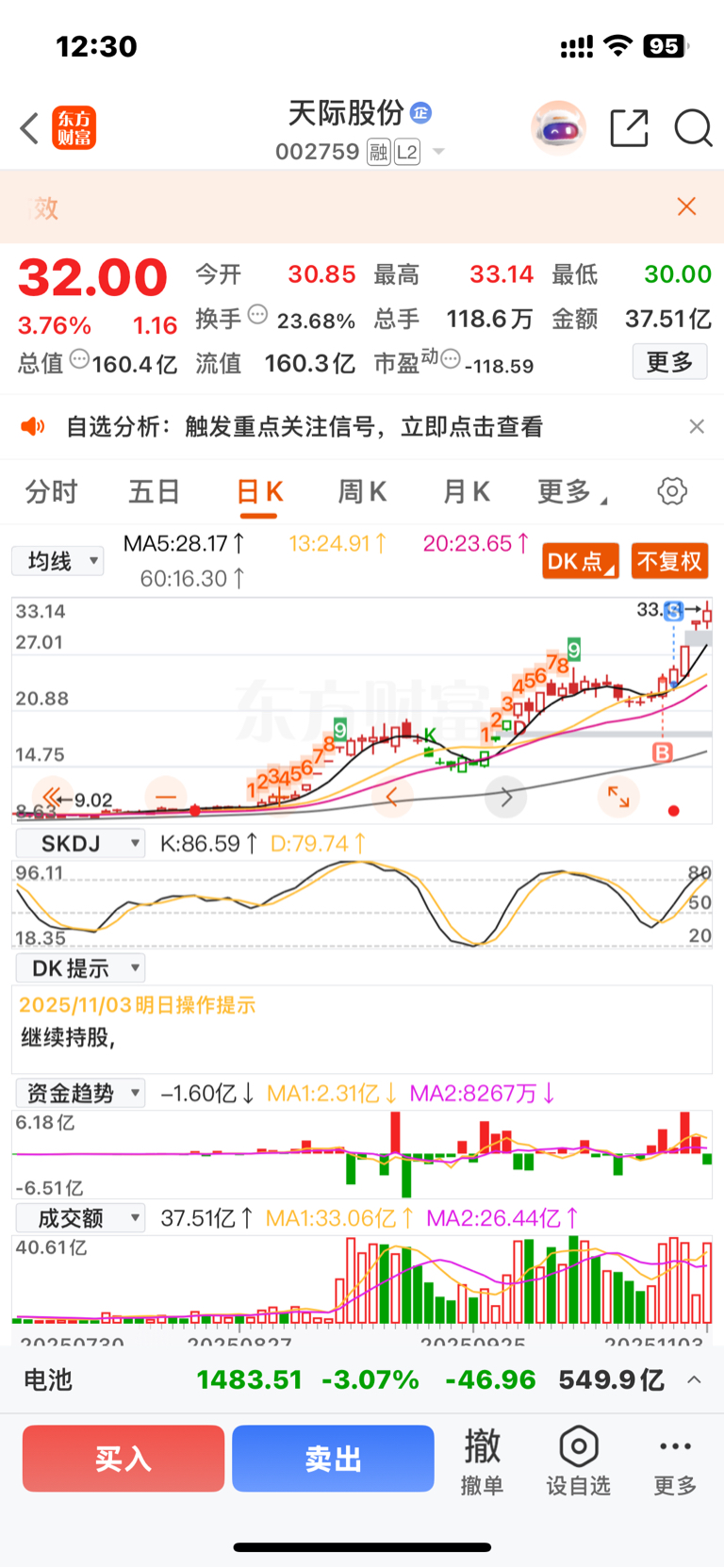 $天际股份(SZ002759)$ 当天卖在最高点!自己还很高兴