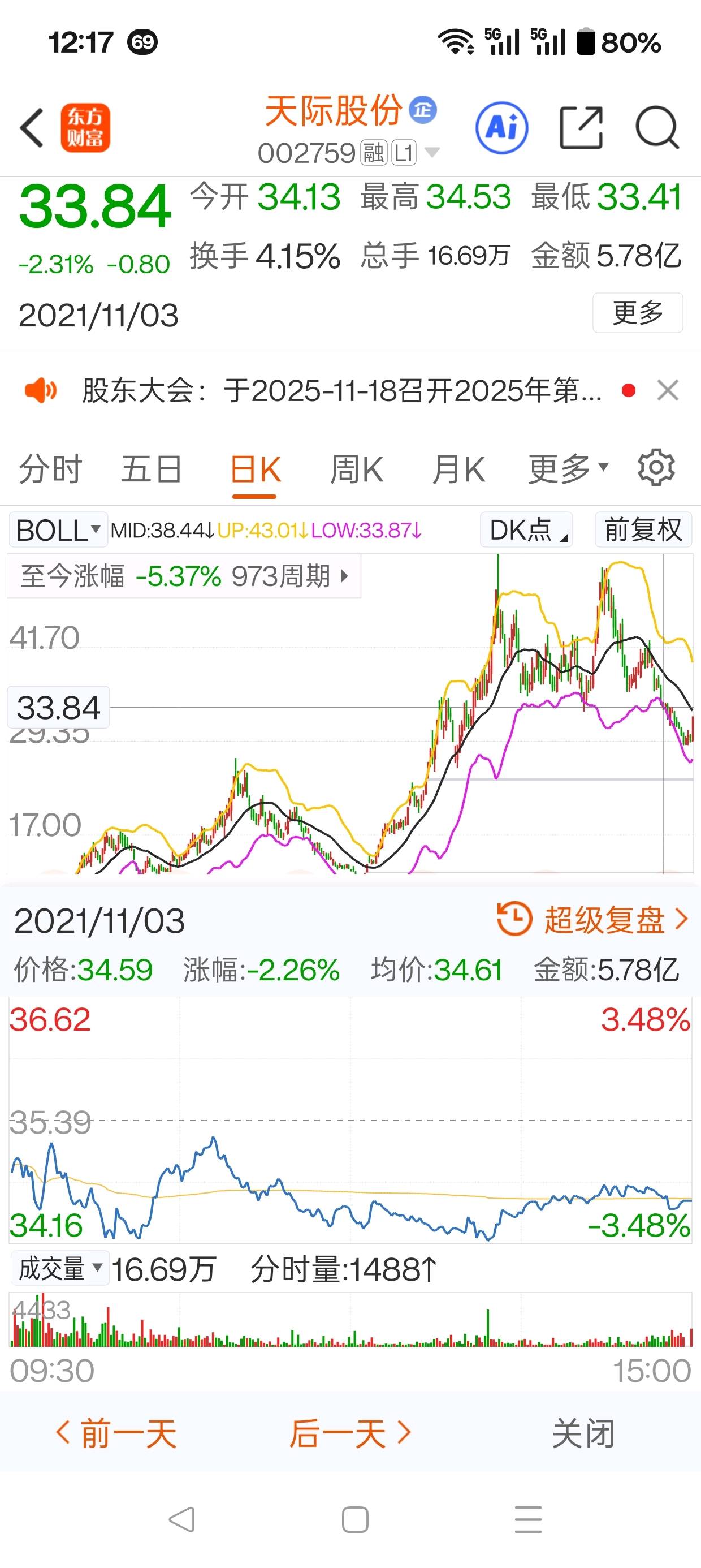 $天际股份(SZ002759)$ 2021年做的头部区域,套牢盘多多,那一年11月3日以后就再也没有上去过,那天的最低价33.41,即将成为这轮反弹的最高点,摸到了就下跌。预计跌幅百分之二十。大家,下午自己看着办吧。