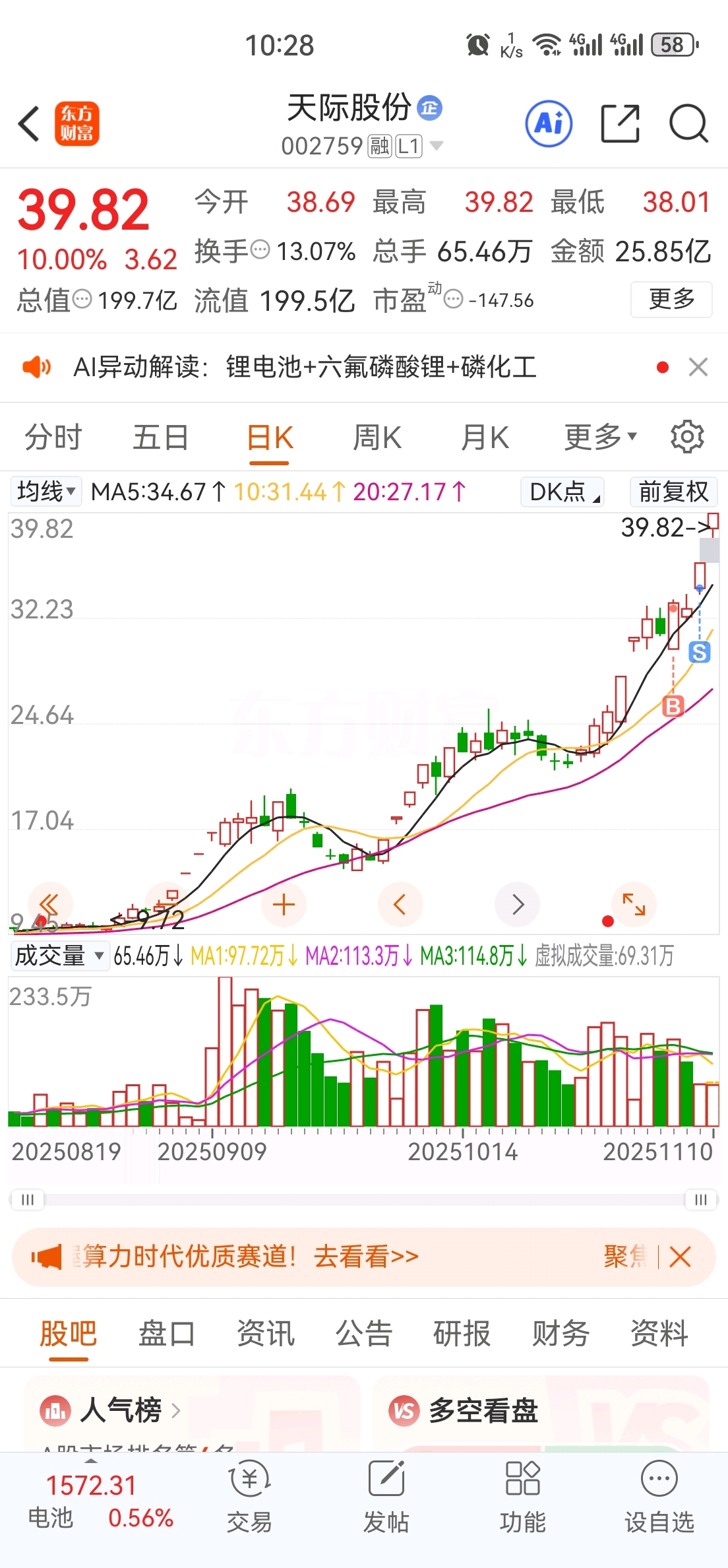 $天际股份(SZ002759)$ 格局认知真不行,9月初就关注到天际、天赐、多氟多几只,当时才10多块,以为是走题材的没敢买,上周看到是产业趋势,忍不住进了,但又吃几个点就跑,真赚不到认知外的钱