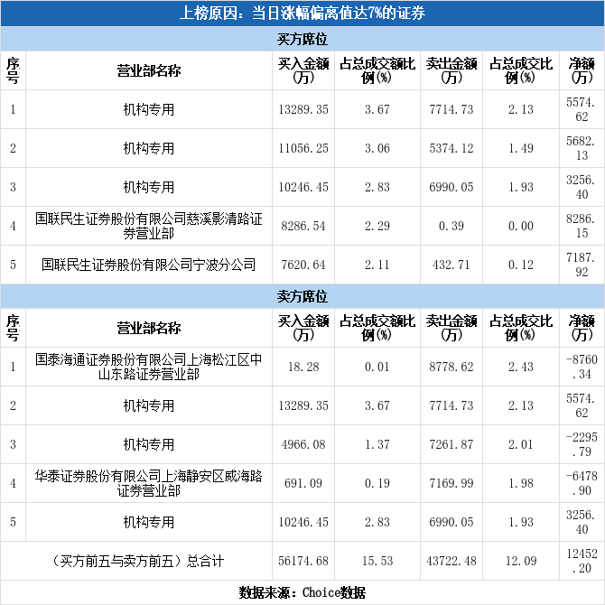 龙虎榜数据显示,今日共6个机构席位出现在龙虎榜单上,分别位列买一、买二、买三、卖二、卖三、卖五,合计净买入1.22亿元,占龙虎榜净买额的98.11%。