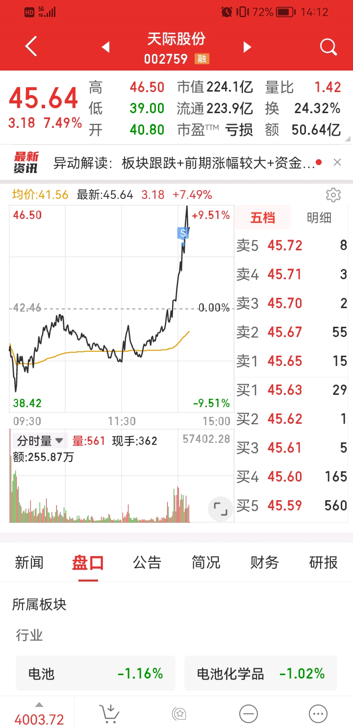 $天际股份(SZ002759)$ 45元减仓卖飞,拉到9个多点又舍不得卖,有种要涨停的错觉,这就是庄家利用的人性,只能7.5个点又卖了