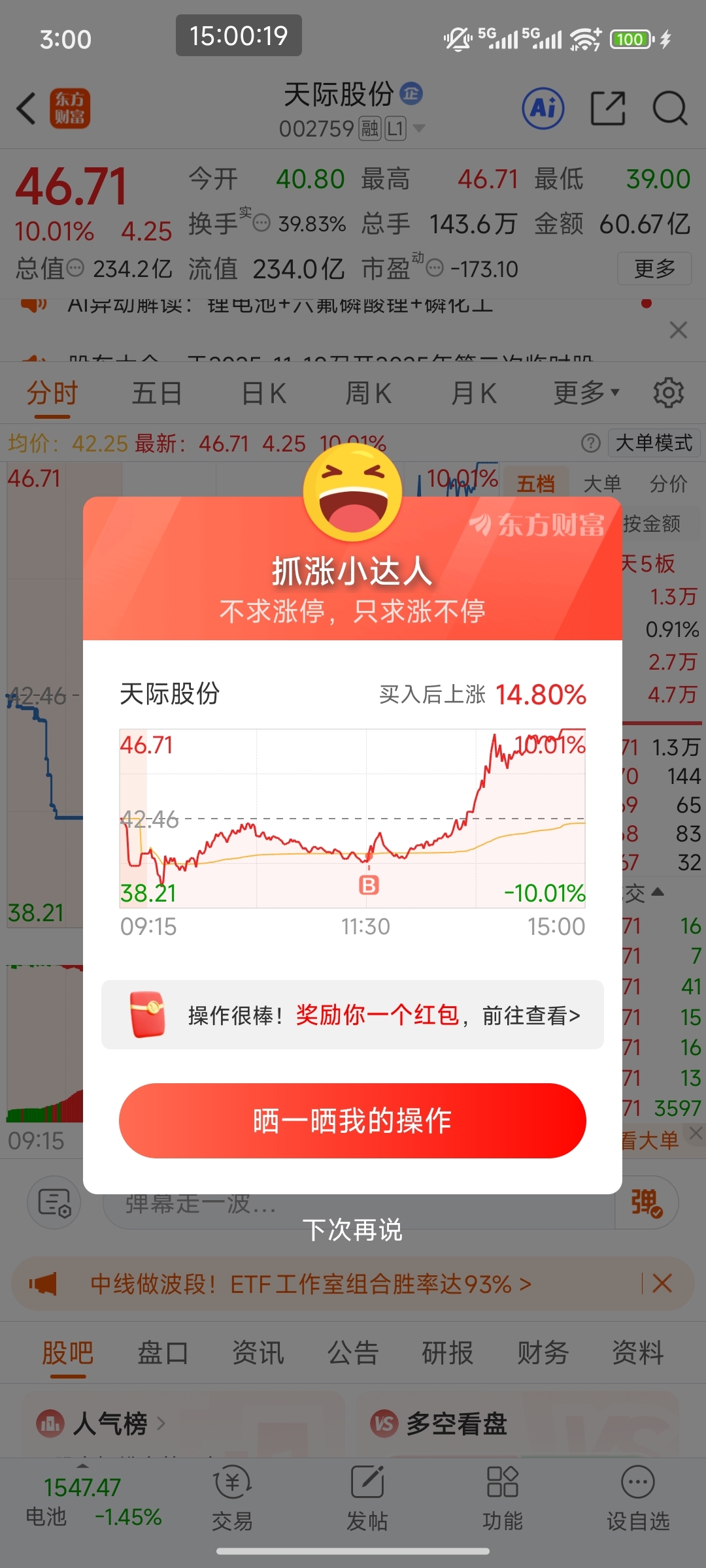 $天际股份(SZ002759)$ 本来今天亏5000多,现在赚1000多,多谢天际哥